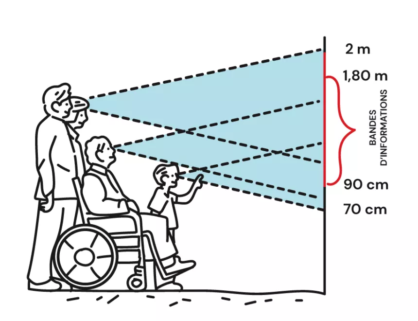 - À partir de 1,60 m de hauteur, la taille des caractères doit être agrandie et le contraste renforcé