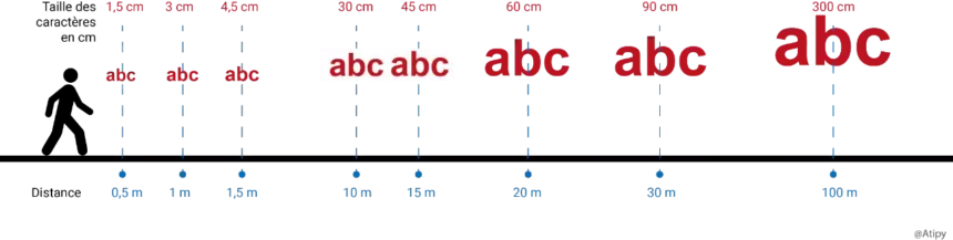 Il est en général recommandé que la taille des caractères soit au minimum de 3% de la distance de lecture (3 cm pour 1 m). Voir schéma ci-dessous